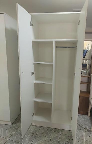 Ağ rəngli iki qapılı paltar dolabı. - Sadə və modern dizayn, hamar səth və xilitsiz görünüş - Metal tutacaqlar, möhkəm menteşələr - Daxili quruluş: - Sağ tərəfdə uzun geyimlər üçün asılqan borus...
