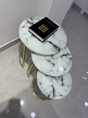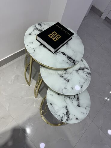 Qızılı metal ayaqlı 3-lü zigon stol dəsti - Dairəvi üstlər: qara mərmər naxışlı, parlaq qızılı kənar haşiyə - Ölçülər: üç fərqli hündürlükdə bir-birinin altına girə bilən dizayn (nesting) - Korpus...