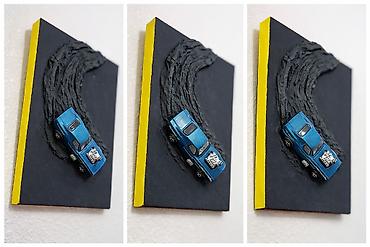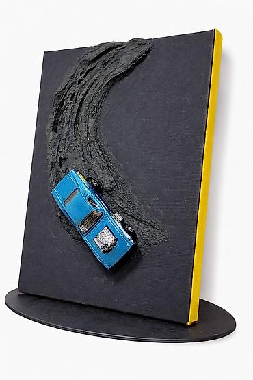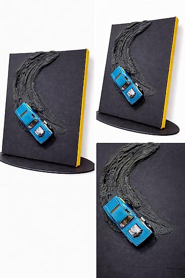 - Texnika: qarışıq media, relyef teksturalı fon üzərində 1:64 miqyaslı die-cast model avtomobil (metall gövdə, xrom mühərrik detalları).