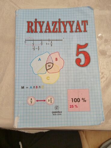 - 5-ci sinif “Riyaziyyat” dərsliyi. Üz qabığında kəsrlər, oxlar üzərində göstəricilər, çoxluqların kəsişməsi (A ∩ B ∩ C) və faiz mövzuları üzrə sxemlər yer alır. Nəşriyyat: Çaşıoğlu, Bakı-2009.