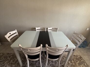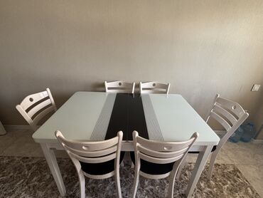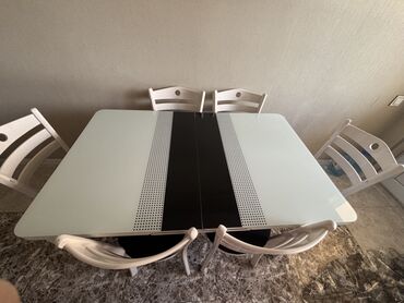 - Rəng: ağ (stulların oturacaq hissəsi qara), masanın üstü şüşə