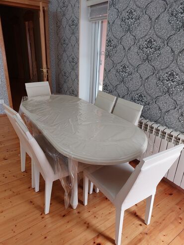 Açıq rəngli, oval formada yemək masası və altı ədəd uyğun stuldan ibarət yemək dəsti. Masa səthi qoruyucu plastik örtüklə örtülmüşdür. Stullar müasir dizaynlı olub, yemək otağınız üçün rahat və zərif bir seçim təşkil edir. Bu dəst, ailə yeməkləri və ya qonaqları qəbul etmək üçün ideal bir həlldir.