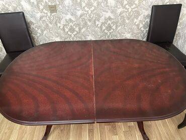 Endirim olunur. Az işlənibdir, qədimi stoldur, sınığı yoxdur. Oval formalı, qəhvəyi rəngli taxta yemək masası. Masa səthi parlaq örtüklüdür və üzərində naxışlı dizayn var. Dörd əyri ayaq masaya zə...