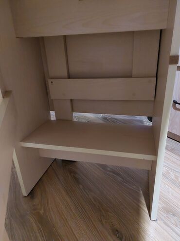 - Detallar: mərkəzdə kiçik rəf/raf kimi istifadə oluna bilən alt polka; sabitlik üçün enli dayaq panelləri; hamar masaüstü