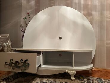 Şəkillərdə bütün detalları görünür: çekmecə, açıq rəflər, kabel keçidi və arxa panelin dairəvi forması. Dizayn interyerə elegan görüntü qatır . ( ciddi şəxslər narahat etsin ancaq zengnen elaqe saxlayin watsapp yoxdur bu nomrede