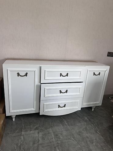 Ağ rəngdə dəst: vitrin şkafı, TV altlığı və bufet-güzgü. - Üslub: müasir-klassik xəttlər, qızılı tonlarda dekorativ tutacaqlar və metal ayaqlar. - Material: korpus boyalı MDF/LDSP tipli taxta lövh...