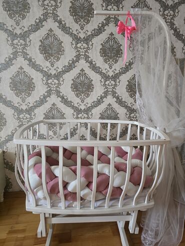 Ağ rəngli taxta beşik – yelləncək konstruksiyalı, oval formalı.