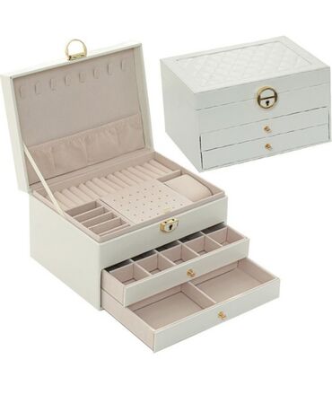 Digər materialZərgərlik və aksesuarların səliqəli saxlanması üçün nəzərdə tutulmuş ağ rəngli qutu. Qutu bir çox bölmələrə və siyirmələrə malikdir, bu da üzüklər, sırğalar, boyunbağılar və qolbaqlar üçün əlverişli yerləşdirmə imkanı verir. Yuxarı qapaqda və siyirmələrdə qızılı rəngli qulplar və bərkidicilər mövcuddur. Klassik və funksional dizaynı ilə evdə və ya səyahətlərdə istifadə üçün uyğundur.