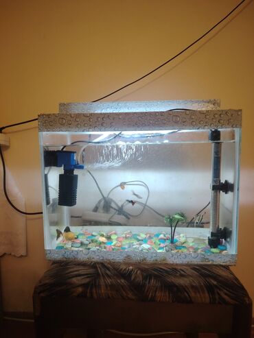 Akvaryum dəsti – bitkilərlə və aksessuarlarla+yem - Şüşə akvaryum, düz bucaqlı forma - Üst hissədə LED işıqlandırma lampası (sərin tonlu, şlanqlı-klipsli dirək) - Daxili filtr və hava verən nasos ...