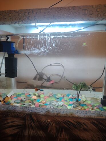 Akvaryum komplekti - Şüşə akvarium: təxminən orta ölçülü, düz şüşə divarlı, ön hissə tam şəffaf. - Daxili filtr və aerasiya: sağ tərəfdə sualtı nasos/filtr bloku, hava şlanqlı oksigenləndirmə. Suy...