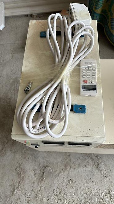 - Komplekt: qalın qoşma kabeli, çoxluq rozetkalı uzatma blokusu; üstündə pult (SET TEMPERATURE yazılı) görünür