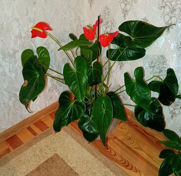 Şəkillərdə görünən parlaq qırmızı çiçəkləri və tünd yaşıl yarpaqları olan Anturium otaq bitkisi. Bitki dərin yaşıl rəngli ürək formalı yarpaqlara və səciyyəvi parlaq qırmızı, şam formalı çiçəklərə malikdir. Anturium isti və rütubətli iqlimi sevir və evdəki istənilən guşəni canlandırır. Bu gözəl bitki evinizə təbiət toxunuşu qatmaq və ya dostlarınız üçün ideal hədiyyə ola bilər. Bitkinin saxlanması asandır və müntəzəm qulluqla uzun müddət çiçək açır. Qabda təqdim olunan bitki həm dekorativ, həm də canlı bir detaldır.
