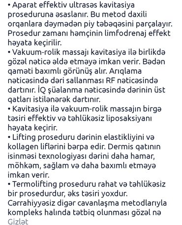 Kavitasiya, RF liftinq, Vakuum massaj, Təlim keçirilir