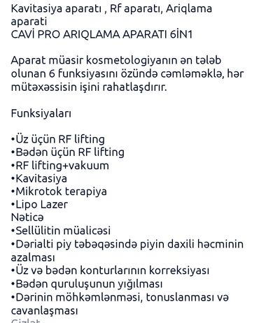 Cavitasiya RF cihazı üz və bədəndə prosedurlar icra etmək üçün fərqli və çoxsaylı başlığa sahibdir. Üz, dəri və bədən forması üçün : Kavitasiya, RF liftinq, LED terapiya və vakuum texnologiyaların...