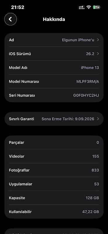 - Yaddaş: 128 GB (təxminən 47,22 GB boş)