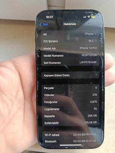 IPhone 14 Pro – 256 GB, qara - Model: iPhone 14 Pro (Model nömrəsi: MQ0T3AA/A) - Yaddaş: 256 GB (təxminən 179 GB boş yer görünür) - iOS versiyası: 18.6.2 - Ekran: Dynamic Island ilə tam ekran OLED...