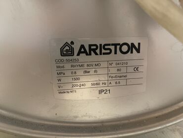 Hamam və mətbəx üçün stabil isti su təminatı, enerji sərfiyyatı 1500 W olan klassik model. Ariston brendinin etibarlı su qızdırma texnologiyası. Model etiketi və texniki məlumatlar şəkillərdə göstərilib.