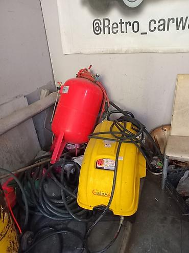 - Yüksək təzyiqli yuyucu Euromac (sarı korpus). Ön paneldə açma/söndürmə düyməsi, təhlükəsizlik xəbərdarlıqları və uzun yüksək təzyiq şlanqları ilə.