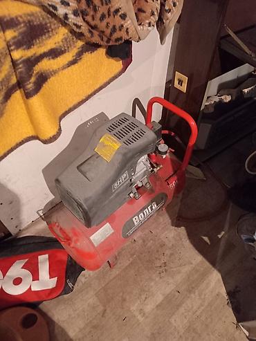 - Hava kompressoru Volga (elektrik, 5HP yazısı görünür). Metal qırmızı qəfəsli çən, təzyiq manometri və sürətli qoşma çıxışı ilə. Şlanq qoşmaq üçün hazır.