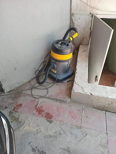 - Sənaye tipli nəm-quru tozsoran (sarı-qara). Üst hissədə idarəetmə, çevik şlanq və təkərli baza ilə rahat daşınma.