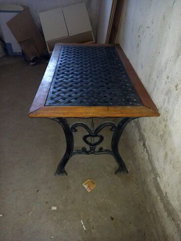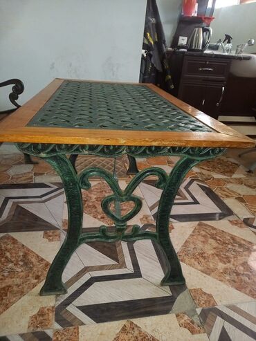 - Dizayn: Dekorativ naxışlı döküm bel və masa üstü (toxunma effektli), bərk ağac kənar çərçivə; əyri formalı dəmir ayaqlar