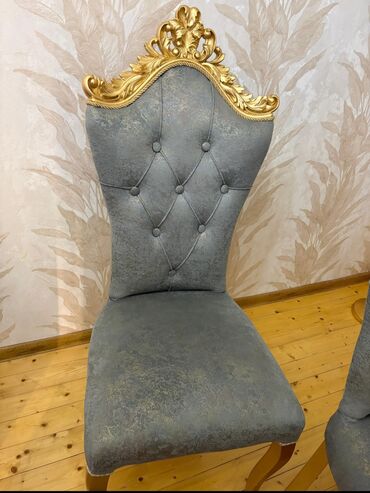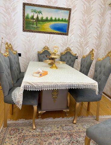 Klassik üslubda 1 stol + 6 stuldan ibarət yemək dəsti. - Rəng: Açıq krem/ağ tonlarında stol, boz rəngli stullar, qızılı dekor elementləri - Stil: Barokko/klassik – oymalı, qızılı ornamentlər və ka...
