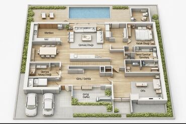 - Ofis: Evin ön tərəfində, ayrıca girişə yaxın, iş/yaradıcılıq üçün geniş iş otağı; istəyə görə kabinet və ya oyun otağı kimi istifadə oluna bilər.
