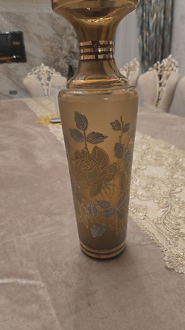 Bohem şüşə dekor dəsti 100manat - Rəng: zümrüd-yaşıl əsas, qızılı haşiyə və əl işləməsi çiçək naxışları - Material: qalın bədii şüşə - Komplekt: 3 hissə - 1 ədəd böyük vaza (ensiz boğazlı, dekor...