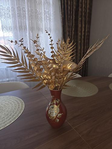 Qızılı naxışlı dekorativ vaza - Material: qalın şüşə/porşelen effektli örtük - Rəng və işləmə: parlaq qızılı örtük, əl işinə bənzər relyef çiçək rəsmləri və qızılı ornamentlər - Forma: ensiz boğaz...