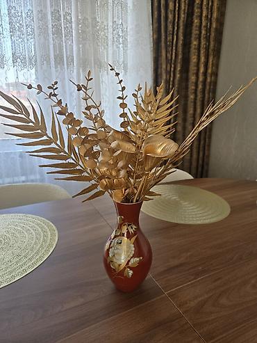 Dekorativ çiçək vazası - Material: Şüşə - Dizayn: Əl işi effektli bəzəklər, çiçək motivləri və qızılı tonlarda laklı örtük - Rəng palitrası: Parıltılı tunc/qızılı gövdə, tünd yaşıl alt hissə, ağ ç...Giriş•Qeydiyyat
