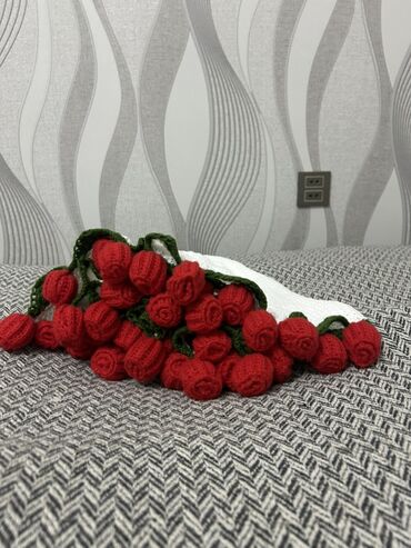 - Material: Yumşaq toxunma iplik; qırmızı qönçələr, yaşıl yarpaqlar və ağ əsas hissə eyni üslubda toxunub.