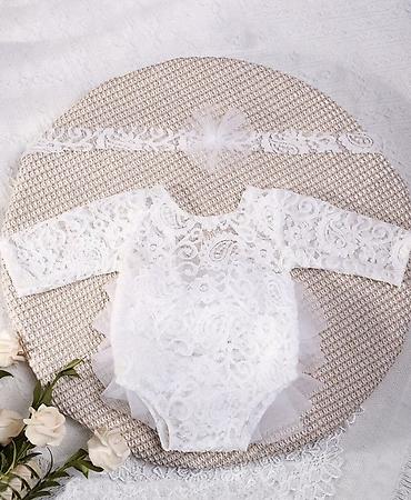 Yeni doğulanlar üçün fotoçəkiliş geyim dəsti - Rəng: krem/şampan - Dəst: 1 ədəd uzunqollu krujeva bodi + uyğun krujeva saç lentı - Material: yumşaq elastik krujeva və nazik tül - Dizayn: arxada ir...