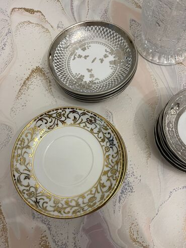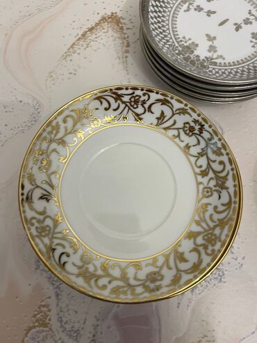 Qızılı naxışlı yemək boşqaqları dəsti - Miqdar: 6 ədəd - Material: porselen/keramika - Forma: dəyirmi, yastı yemək boşqabı - Rəng və dizayn: ağ fon üzərində mozaika effekti; qızılı-şabalıdı rəngli...