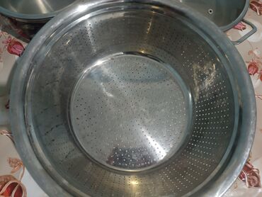 Paslanmayan poladdan iri ölçülü süzgəc (kolander) - Material: paslanmayan polad, parlaq səth - Quruluş: qab formasında, bütün korpus boyunca xırda, bərabər deşiklər – həm dibdə, həm divarlarda - K...