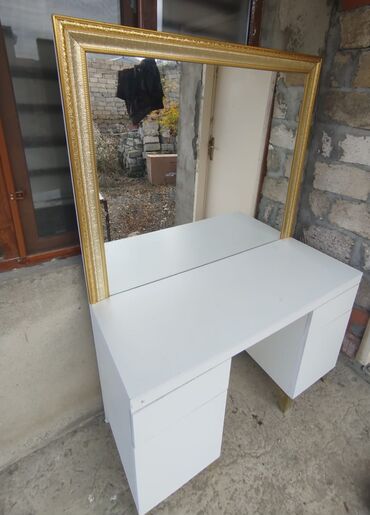 - Dəst tərkibi: geniş iş səthinə malik makiyaj/iş masası və qızılı haşiyəli iri güzgü