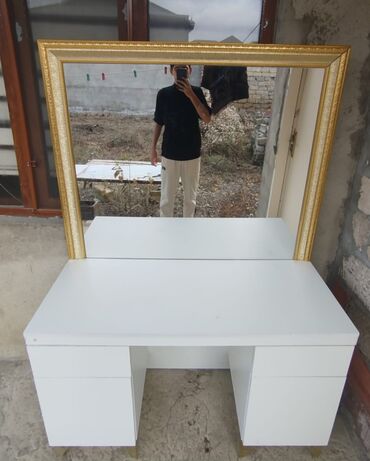 - Ölçü təxmini: güzgü geniş formatlıdır, stol orta ölçülüdür; oturmaq üçün mərkəzdə boşluq mövcuddur