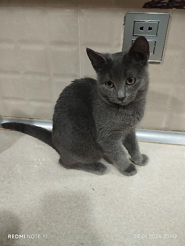 Rus Mavisi tipli boz pişik - Zərif, qısa və sıx tüklü, vahid boz rəngli kürk - Yaşıl tonlu gözlər, iti qulaqlar, incə bədən quruluşu - Sakit, mehriban və ev şəraitinə uyğun xasiyyət - Ev pişiyi ki...