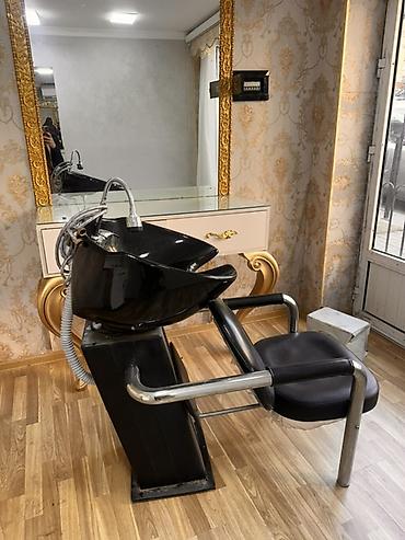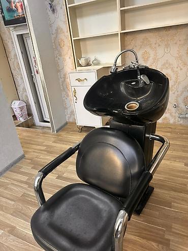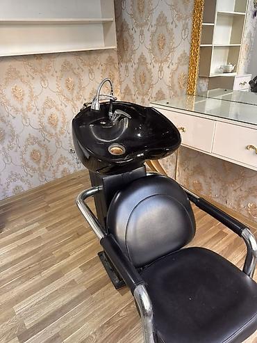 Salonda yuyucu kreslo – parikmaxer/barber üçün yuma bölməsi. - Keramik, dərin lavabo (boyun üçün yumşaq dayaq) - Qarışdırıcı kran və əl duşu (fleksibil hortum) - Qara rəngli, rahat oturacaq və bel...