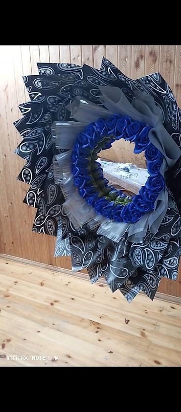 Məxməri-saten güllərdən hazırlanmış dekorativ buketlər - Material: yüksək keyfiyyətli saten/məxməri lentlərdən əl işidir, gül ləçəkləri sıx və həcmli formadadır. - Kompozisiyalar: dairəvi forma, ç...