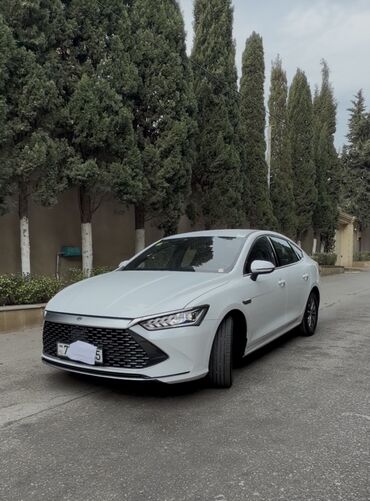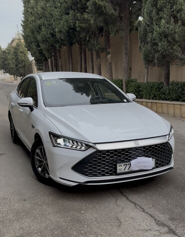 BYD Qin Plus DM-i sedan - Kuzov: ağ rəngli, aerodinamik xəttlər, tam LED ön faralar, arxa hissədə LED “light bar”, BYD və “Qin” emblemləri - Güc qurğusu: DM-i hibrid sistemi (benzin mühərriki + el...