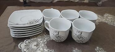 Ağ rəngli fincan dəsti – 5 fincan və 6 kvadrat formalı boşqabdan ibarət.