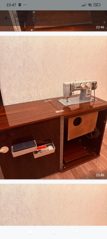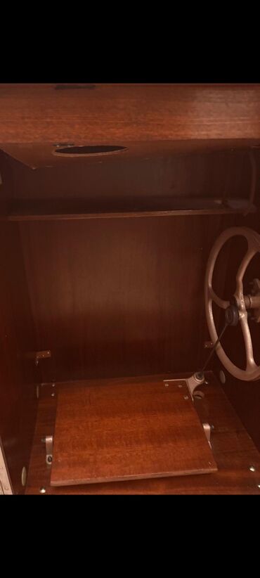 - Şkaf tipli taxta kabinet: parlaq laklı səth, qatlanan geniş iş masası, içəridə pedal və kasnak mexanizmi