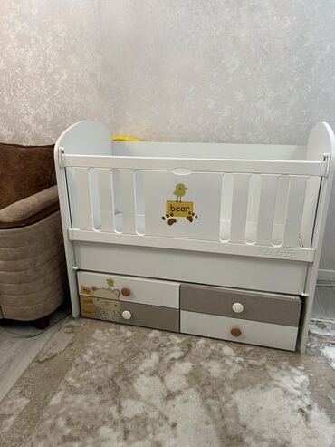 Ağ rəngdə, taxtadan hazırlanmış, üzərində ayı rəsmi olan uşaq çarpayısı. Çarpayının aşağı hissəsində iki ədəd çekmece var. Çekmeceler ağ rəngdə olan nöqtələrlə bəzədilib. Körpələr üçün rahat və təh...