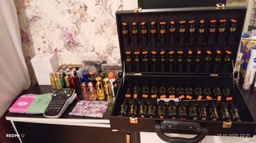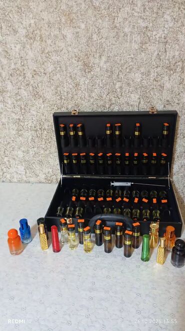 - Portativ çamadan içində onlarla ətir esansı: müxtəlif kişi və qadın kompozisiyaları. Flakonlar etiketlidir, nümunə və doldurma üçün nəzərdə tutulub.