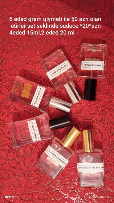 - Foto 3-də göstərilən set: 6 ədəd – 4 ədəd 15 ml, 2 ədəd 20 ml. Üzərində yazı: “6 ədəd qram qiyməti ilə 50 AZN olan ətirlər set şəklində sadəcə 20 AZN”.