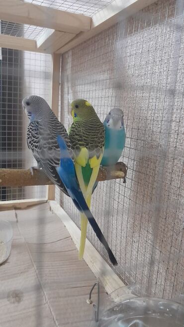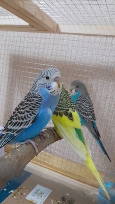 Məhsul: Dalmatin və klassik rəng çalarlarında (mavi-ağ, sarı-yaşıl, mavi) dalğalı tutuquşular (budgerigar)