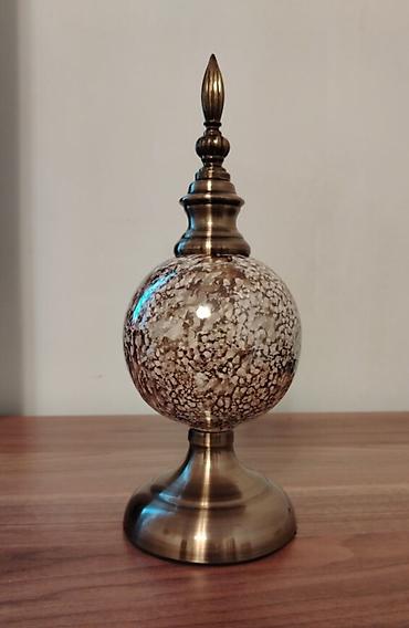 - Şüşə kürəli dekor: Antik qızılı rəngdə metal baza və ucluqla tamamlanan, mozaika effektli şüşə kürədən ibarət kompozisiya. Parıltılı tekstura işıq altında effekt verir və klassik interyerlərlə uyğunlaşır.