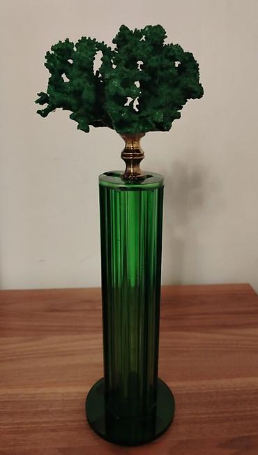 - Yaşıl sütun dekoru: Şaquli kəsimli, şəffaf tünd-yaşıl şüşədən hazırlanmış silindrik postament. Üst hissədə qızılı metal keçid və üzərində qaranquşquyruğu mərcan formasında yaşıl dekor element. Konsol, raf və ya kamın üstü üçün diqqətçəkən vurğu predmetidir.