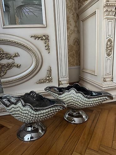 - 2 ədəd iri, dalğalı formalı, ayaqlı meyvə/suxarik qabı – güzgü effekti verən metalik gövdə, kənarları dalğalı, xaricdən çoxsıralı incəbənd mirvari bəzəkləri.
