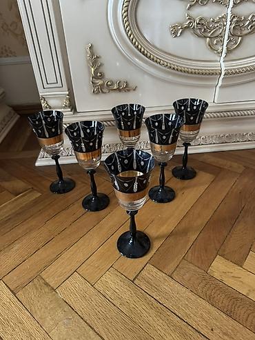 - 6 ədəd qrafin/stəkan tipli bokal – qara ayaqlı, şüşə kasa hissəsi, qara və qızılı dekor zolaqları, damcı motivli naxış.
